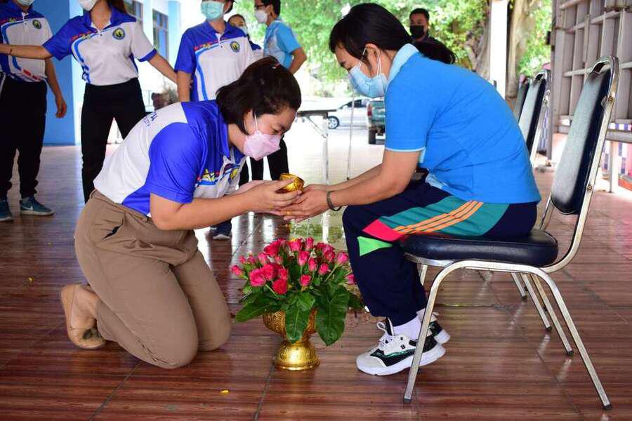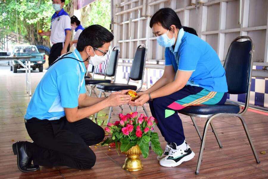 นายพิเชษฐ์ ตนะวัฒนา ผู้อำนวยการสถานศึกษา และนายสรศักดิ์ กิมเห รองผู้อำนวยการสถานศึกษา พร้อมด้วยหัวหน้างาน 4 ฝ่าย และคณะครูโรงเรียนเทศบาล ๑ บ้านสามพราน (นครสาระผดุงวิทย์) รดน้ำขอพรผู้บริหารเทศบาลเมืองสามพรานเนื่องในเทศกาลสงกรานต์ ณ เทศบาลเมืองสามพราน เมื่อวันที่ 8 เมษายน 2565 S:0