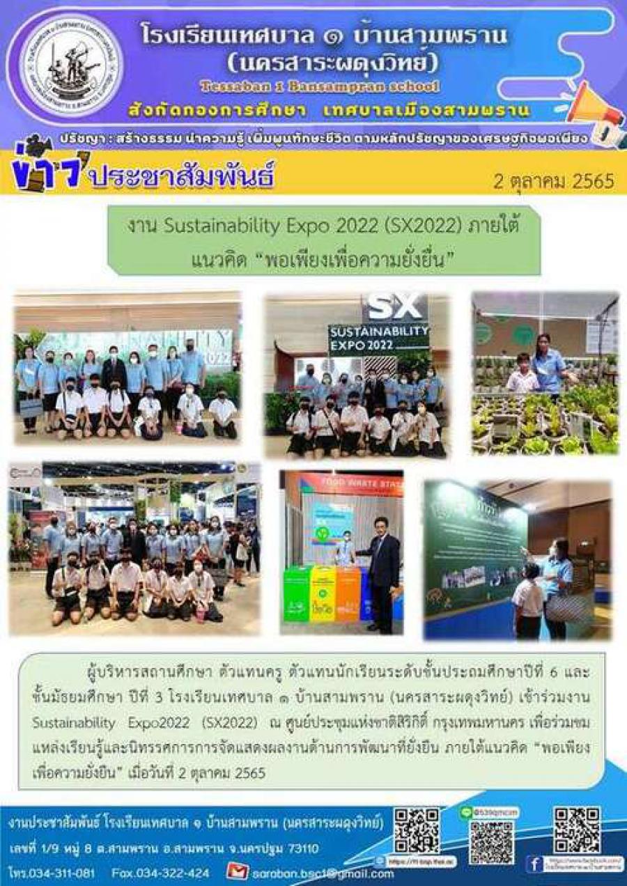 ผู้บริหารสถานศึกษา ตัวแทนครู ตัวแทนนักเรียนระดับชั้นประถมศึกษาปีที่ 6 และชั้นมัธยมศึกษาปีที่ 3 โรงเรียนเทศบาล ๑ บ้านสามพราน (นครสาระผดุงวิทย์) เข้าร่วมงาน Sustainability Expo 2022 (SX2022) ณ ศูนย์ประชุมแห่งชาติสิริกิติ์ กรุงเทพมหานคร เพื่อร่วมชมแหล่งเรียนรู้และนิทรรศการการจัดแสดงผลงานด้านการพัฒนาที่ยั่งยืน ภายใต้แนวคิด ?พอเพียงเพื่อความยั่งยืน? เมื่อวันที่ 2 ตุลาคม 2565 S:0