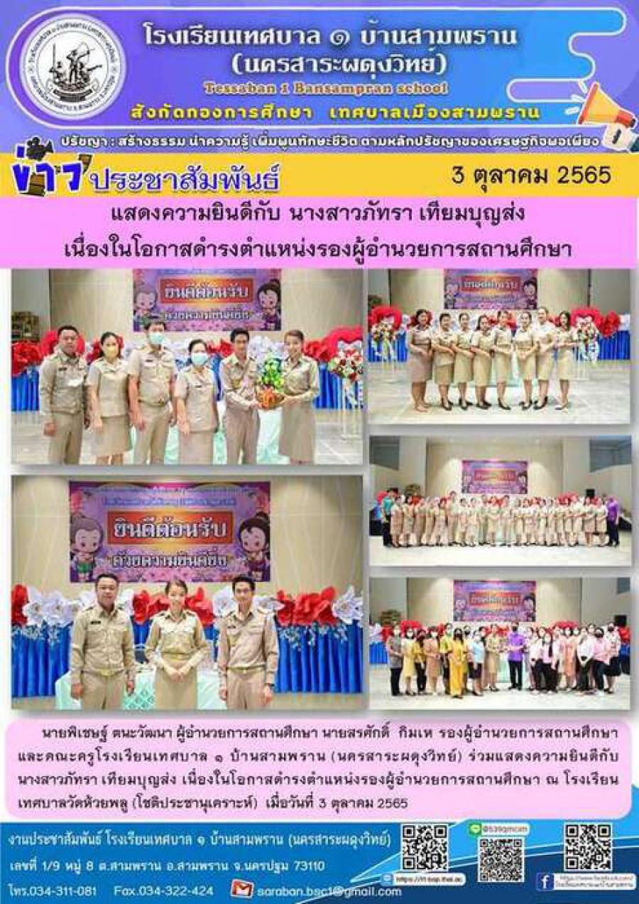 นายพิเชษฐ์ ตนะวัฒนา ผู้อำนวยการสถานศึกษา นายสรศักดิ์ กิมเห รองผู้อำนวยการสถานศึกษา และคณะครูโรงเรียนเทศบาล ๑ บ้านสามพราน (นครสาระผดุงวิทย์) ร่วมแสดงความยินดีกับ นางสาวภัทรา เทียมบุญส่ง เนื่องในโอกาสดำรงตำแหน่งรองผู้อำนวยการสถานศึกษา ณ โรงเรียนเทศบาลวัดห้วยพลู (โชติประชานุเคราะห์) เมื่อวันที่ 3 ตุลาคม 2565 S:0