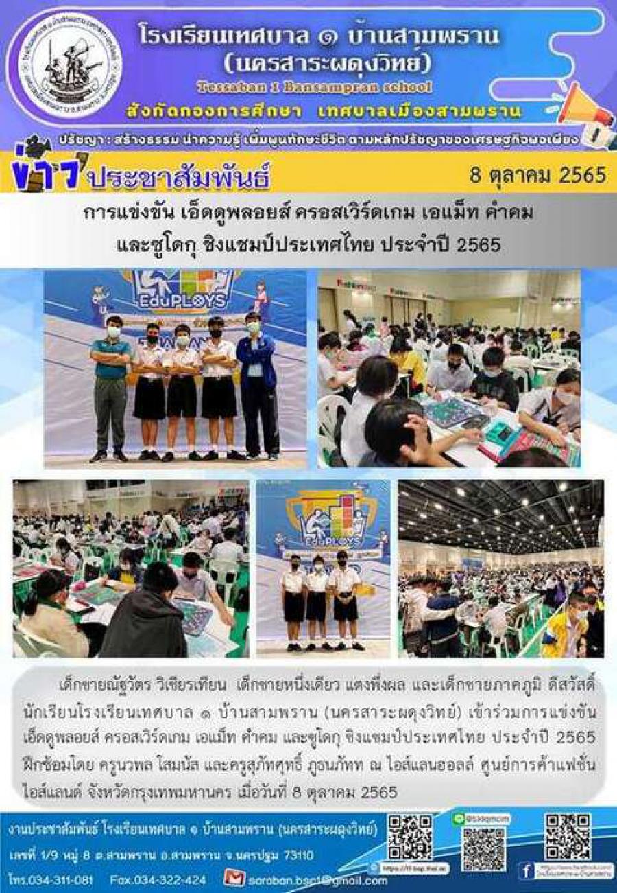 เด็กชายณัฐวัตร วิเชียรเทียน เด็กชายหนึ่งเดียว แตงพึ่งผล และเด็กชายภาคภูมิ ดีสวัสดิ์ นักเรียนโรงเรียนเทศบาล ๑ บ้านสามพราน (นครสาระผดุงวิทย์) เข้าร่วมการแข่งขัน เอ็ดดูพลอยส์ ครอสเวิร์ดเกม เอแม็ท คำคม และซูโดกุ ชิงแชมป์ประเทศไทย ประจำปี 2565 ฝึกซ้อมโดย ครูนวพล โสมนัส และครูสุภัทศุทธิ์ ภูธนภัทท ณ ไอส์แลนฮอลล์ ศูนย์การค้าแฟชั่นไอส์แลนด์ จังหวัดกรุงเทพมหานคร เมื่อวันที่ 8 ตุลาคม 2565 S:0